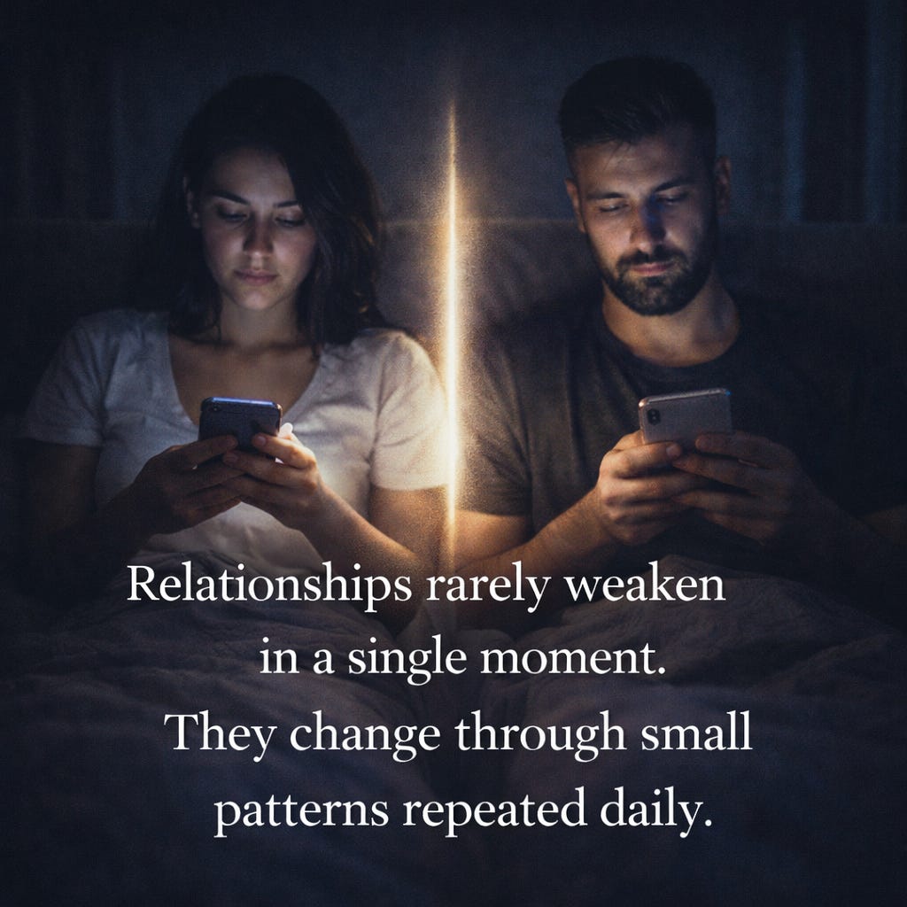 Relationships rarely weaken through dramatic events alone. More often, they shift slowly through small patterns repeated daily. The intention of this essay is simply to invite awareness — not guilt.